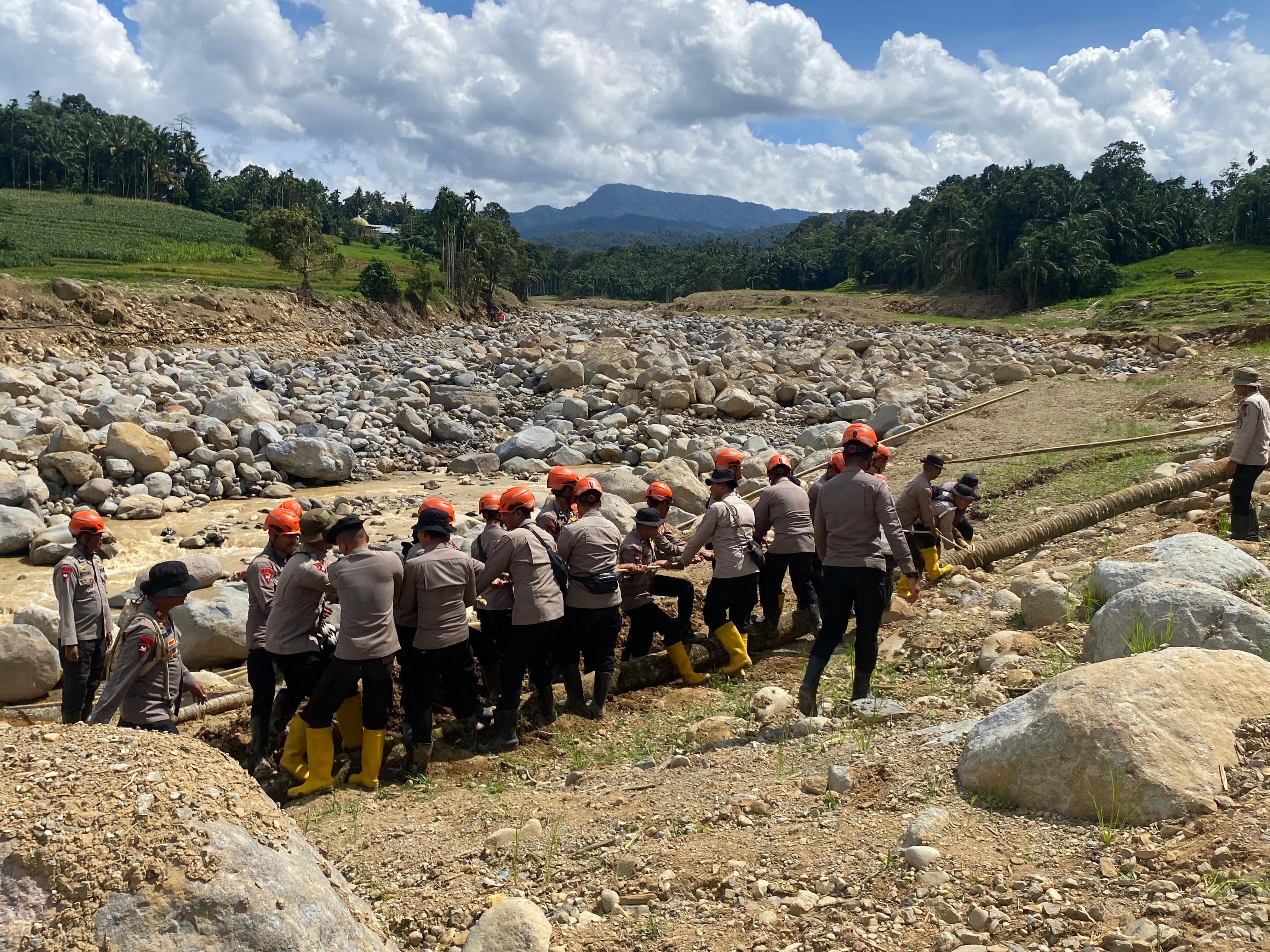 Dalam kegiatan tersebut, personel Brimob bergotong royong mengangkut kayu serta material dasar untuk membangun jembatan darurat. Jembatan ini sangat dibutuhkan masyarakat setempat karena menjadi akses utama penghubung antar desa yang sempat terputus akibat bencana.